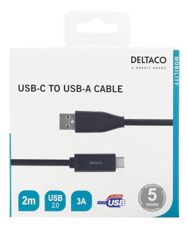 DELTACO USB-C - USB-A-kaapeli, 2 m, 3 A, USB 2.0, musta