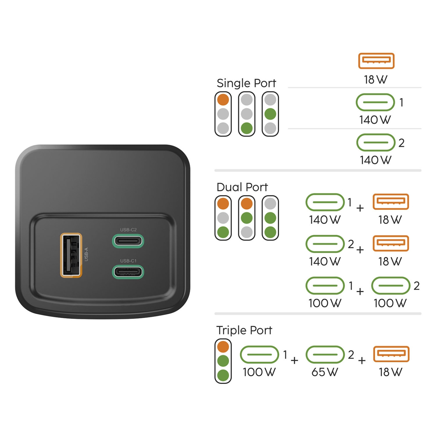 Virtapankissa on kaksi USB-C-porttia ja yksi USB-A-portti, joten voit ladata jopa kolmea laitetta samanaikaisesti. Parhaan latausnopeuden saavuttamiseksi käytä yhtä USB-C-porttia, jolloin saat täyden 200 W tehon. Kahden USB-C-portin käyttö jakaa tehon tasaisesti 100 W:iin porttia kohden, ja USB-A-portti tarjoaa lisävirtaa 18 W, jotta kaikki laitteesi latautuvat tehokkaasti.
