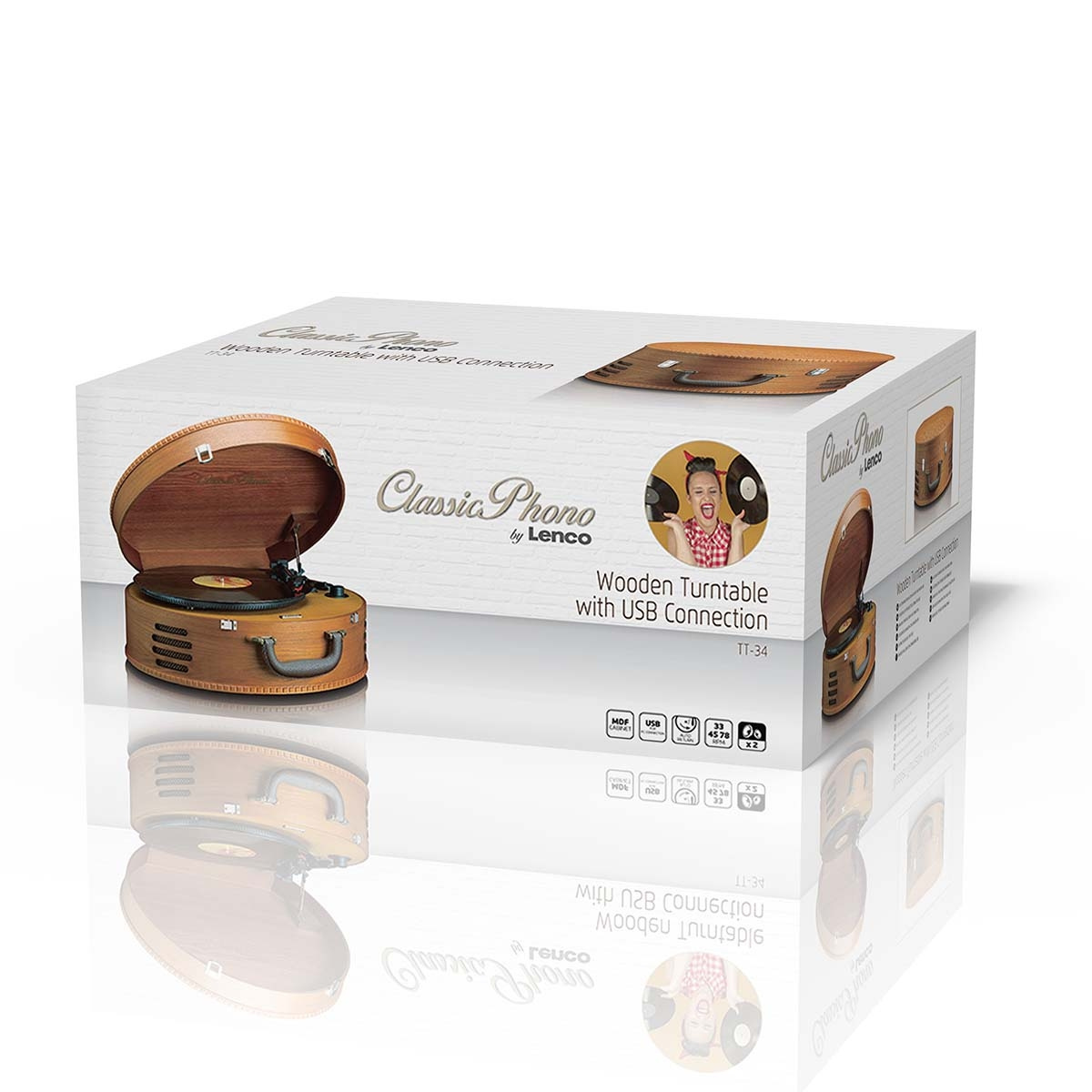 Classic Phono TT-34:ssä on keraaminen stereokasetti neulalla. Voit toistaa levyjäsi 3 nopeudella: 33 RPM, 45 RPM ja 78 RPM, ja soittimessa on myös automaattinen palautus. Levysoittimessa on hihnakäyttö ja 2 sisäänrakennettua kaiutinta.