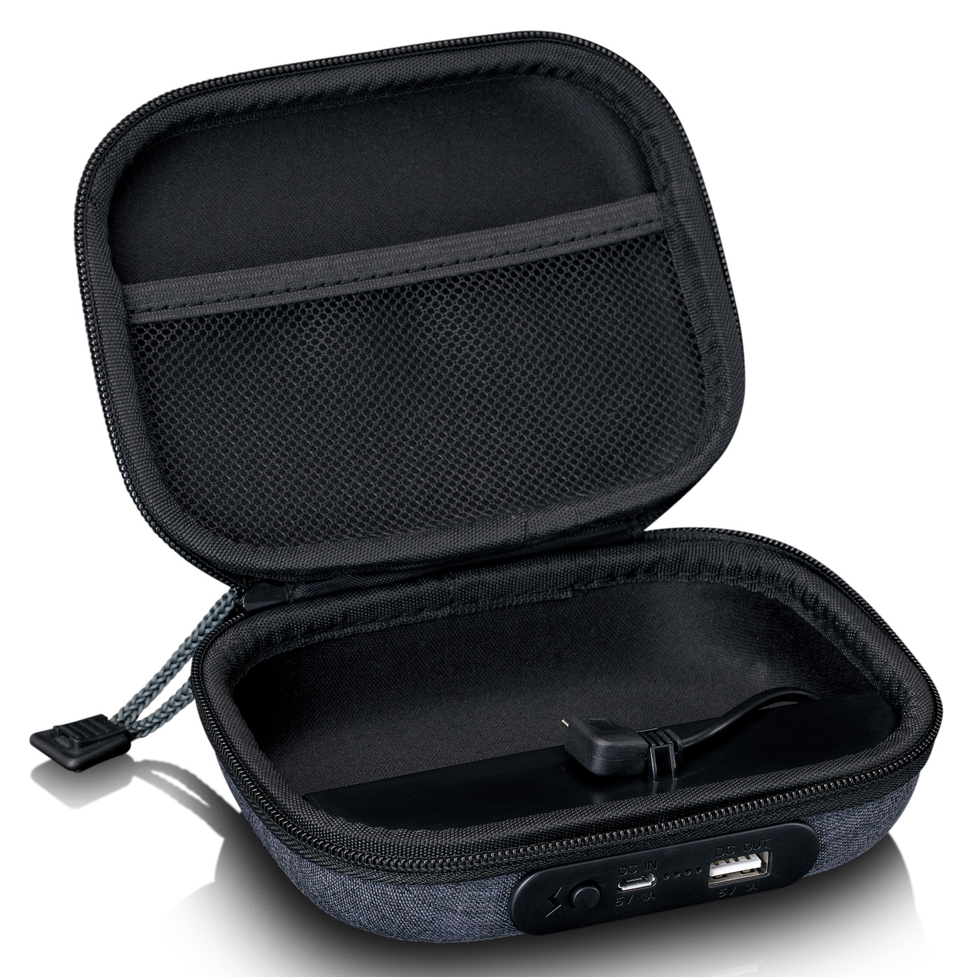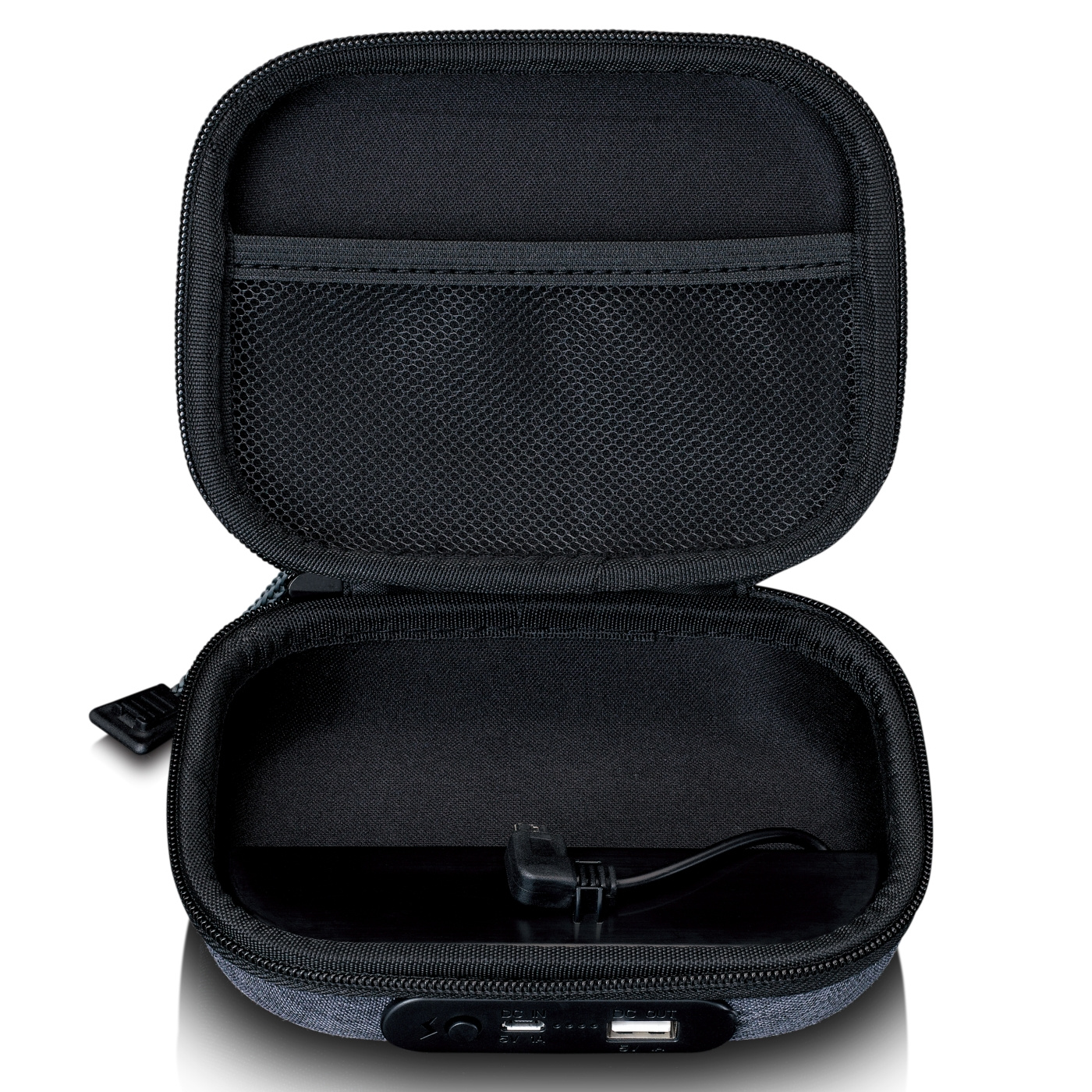 Mutta tämä kotelo on enemmän kuin vain salkku MP3-soittimelle, se on samalla myös virtapankki. Lataa MP3-soittimesi salkkuun liitetyn mikro-USB-kaapelin avulla. Energiatilanäytön kautta tiedät tarkalleen, kuinka paljon virtaa MP3-soittimessasi on vielä jäljellä.