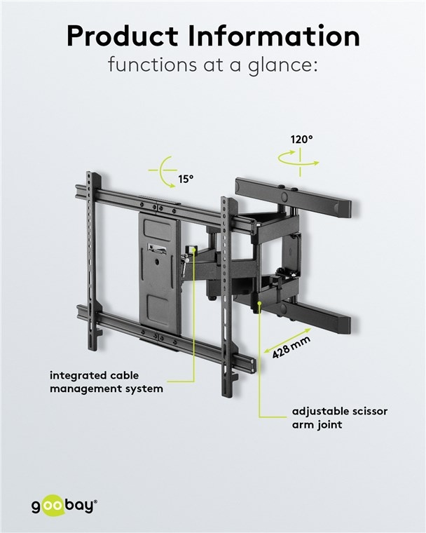 - Väggfästet håller TV: n i läge med endast 77 mm elegant platt och platsbesparande på väggen och kan förlängas upp till 428 mm för att uppnå optimal synvinkel.