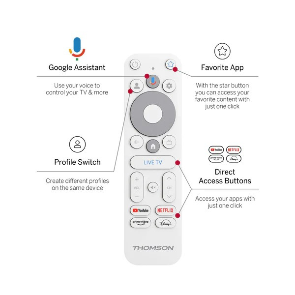 Mukana tuleva kaukosäädin on suunniteltu mukavuutta ja nopeutta varten, ja siinä on Google Assistant -ääniohjaus. Sano vain, mitä etsit – trendikkäistä YouTube-videoista uusimpaan elokuvaan – ja dongle hoitaa loput. Pikanäppäimet antavat nopean pääsyn useimmin käytettyihin sovelluksiin.