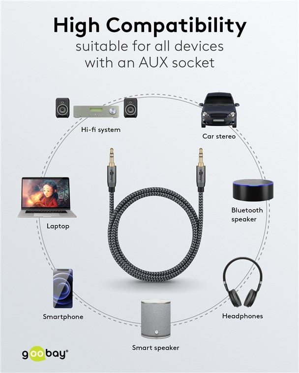 - Ljudkabel för anslutning av t.ex. smartphones och surfplattor till ljudutgångsenheter som hörlurar, PC, förstärkare, SoundBar, högtalare eller bilradio