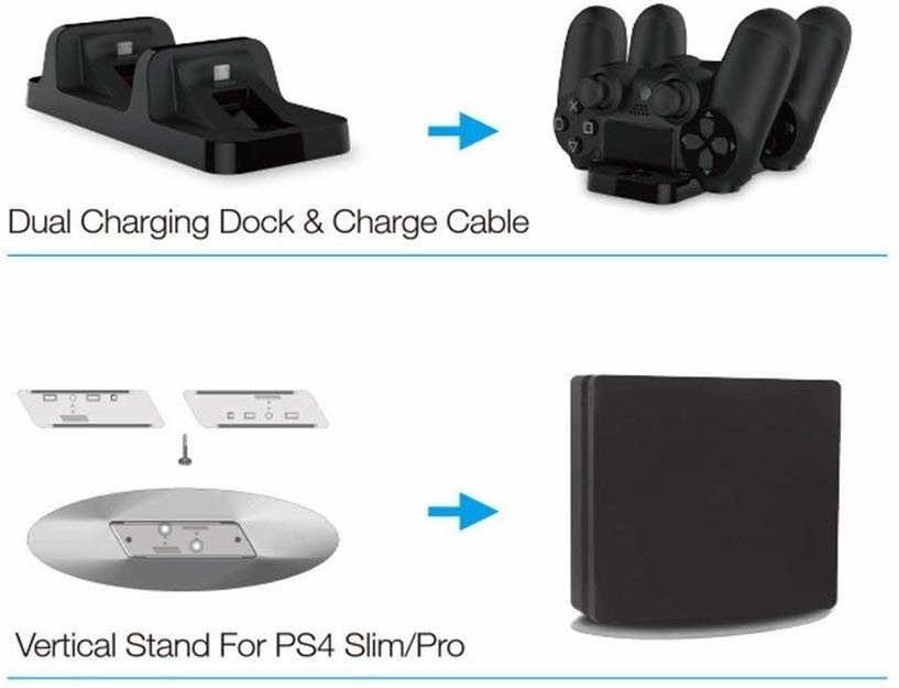 Settiin sisältyy 1 pari stereokuulokkeita, jotka voidaan liittää ohjaimiin. 1 konsolin teline, sopii PS4/Slim/Pro. 4 kpl silikonisuojusta suojaamaan ohjaimen tattioita sekä yksi silikonisuoja ohjaimelle. Ohjaimen suoja suojaa pölyltä, naarmuilta, lialta ja iskuilta. Se on helppo asettaa ja poistaa ja se voidaan helposti pestä vedellä, jos se likaantuu. Mukana tulee myös 1 kpl latausasema kahdelle ohjaimelle ja siihen kuuluva kaapeli.