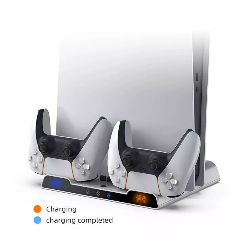 Multifunktionell ladd- och kylplatta för PlayStation 5. Med den här plattan kan du ladda din konsol samtidigt som du kyler ner den och undviker att den blir överhettad. Du kan även ladda dina handkontroller på plattan, på så sätt kan du samla din konsol och dina kontroller på ett och samma ställe.