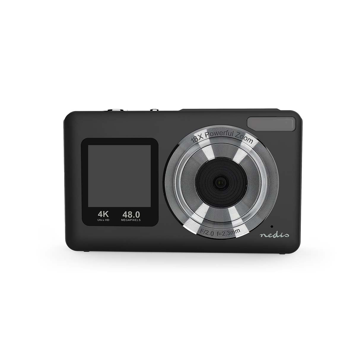 Nedis-kamerassa on kaksi HD-näyttöä: 2,5-tuumainen takanäyttö otosten helppoon rajaamiseen ja 1,3-tuumainen etunäyttö, joka on täydellinen selfieitä ja vlogeja varten. Integroitu mikrofoni ja kaiutin tukevat selkeää äänitallennusta, ja USB-liitäntä mahdollistaa webkameran käytön livestriimausta varten.