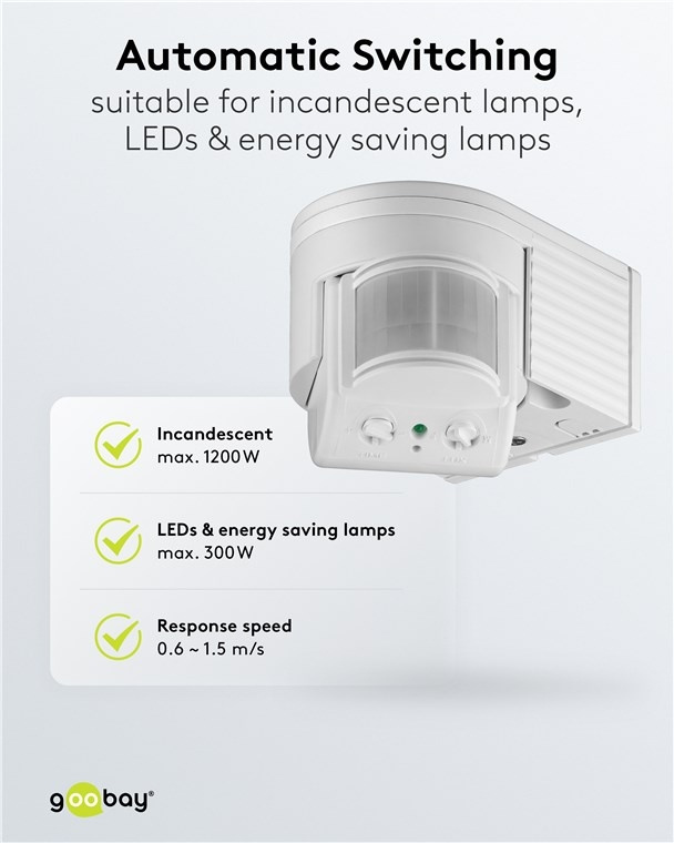 - 180° rörelsedetektor är idealisk för att koppla lampor och lysdioder utomhus.