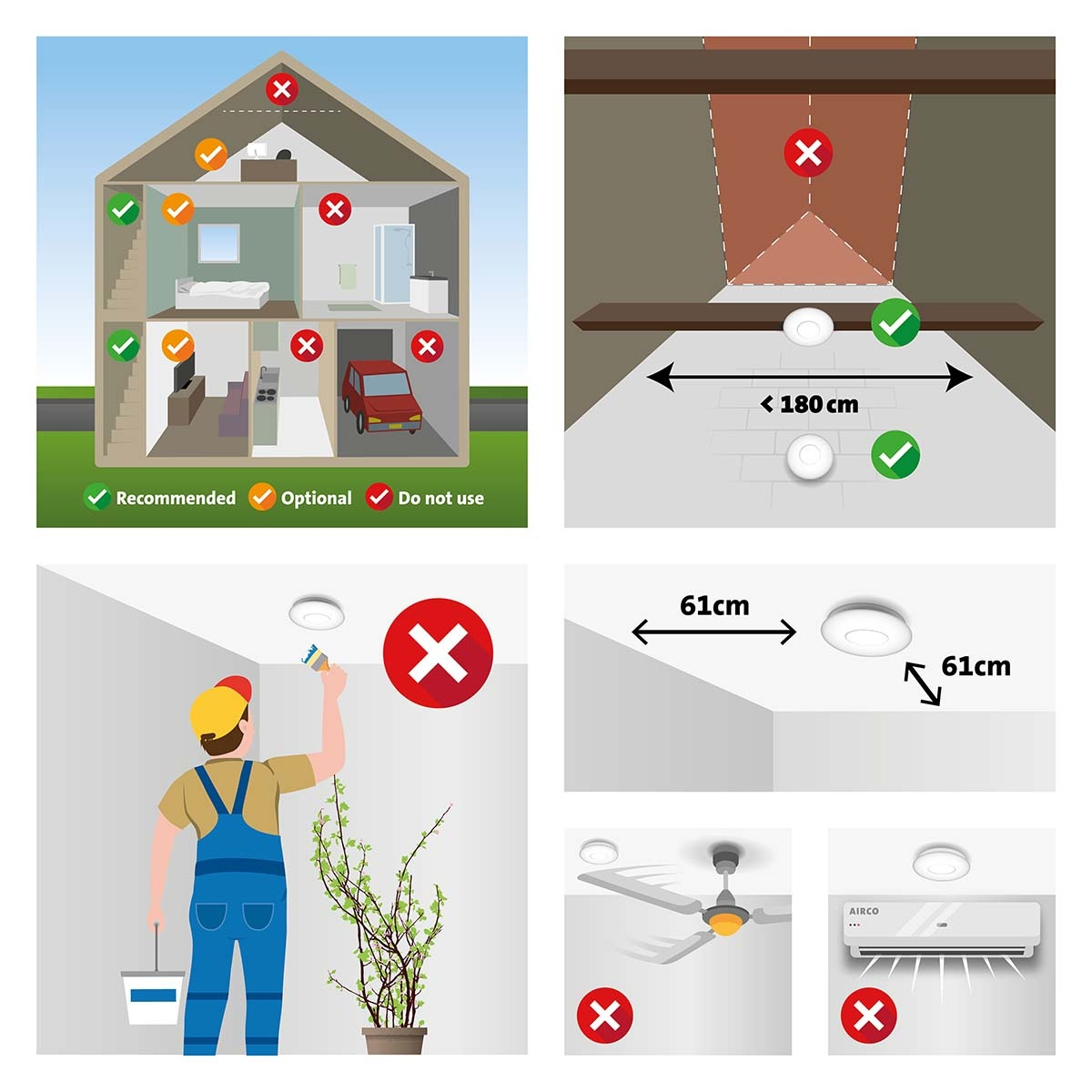 Tämä Alecton kompakti savuilmaisin soveltuu seinä- ja kattoasennukseen, ja se on helppo asentaa haluttuun paikkaan. Vielä helpommaksi sen mukana toimitetaan asennusjalusta, ruuvit ja tulpat. Heti kun savuilmaisin napsautetaan kiinnitysalustaan, ilmaisin aktivoituu. Parhaat paikat savuilmaisimien sijoittamiseen ovat eteinen tai yläkerran porraskäytävä. Nämä ovat usein pakoreittejä, jos talossa syttyy tulipalo. Jos haluat maksimaalisen turvallisuuden, asenna savuilmaisin jokaiseen huoneeseen, jossa tulipalo voi syttyä. SA300 on saatavana myös kahden savunilmaisimen sarjana, SA300 DUO.