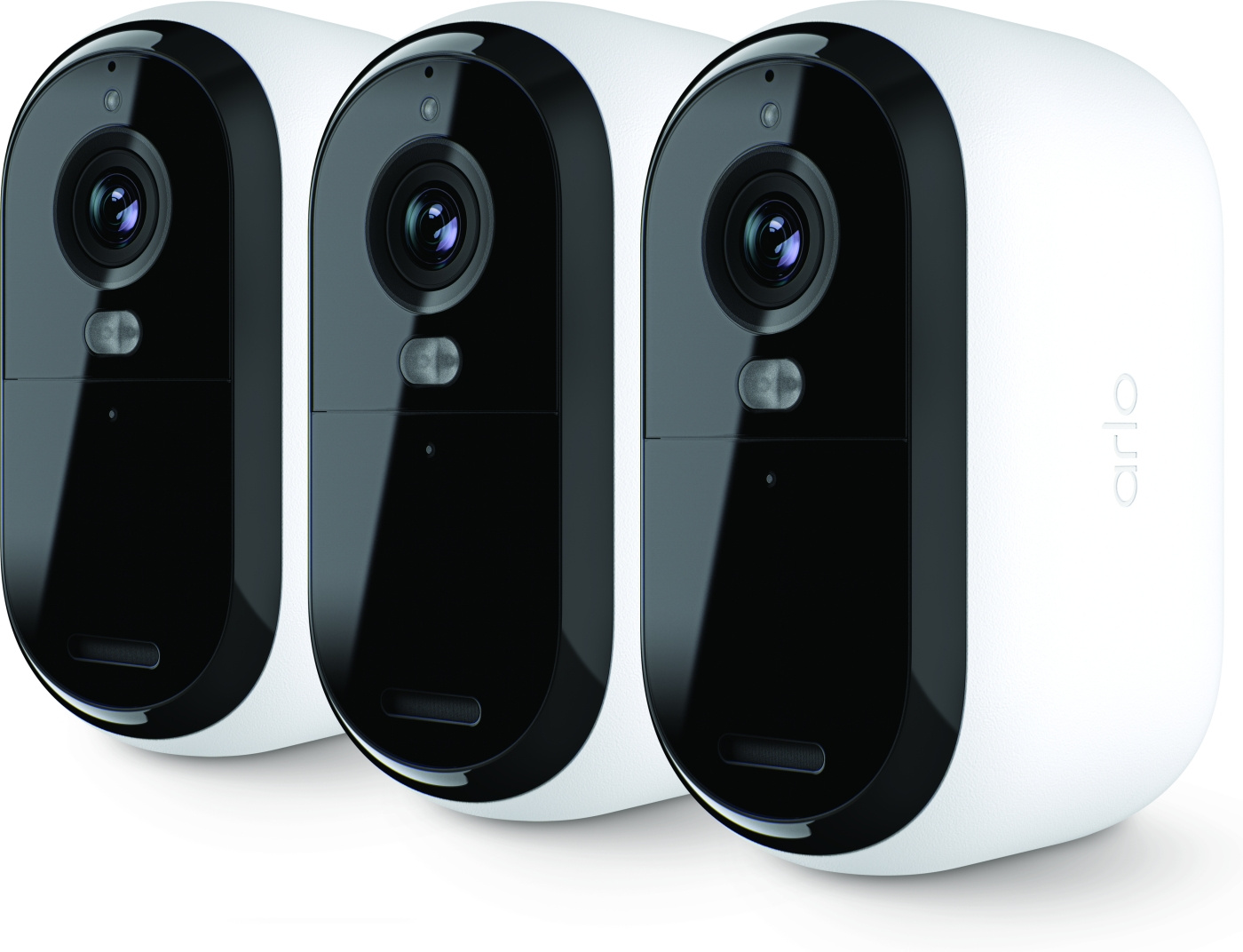 Arlo Essential 2 HD on täysin itsenäinen 2,4 GHz:n Wi-Fi -verkkoon liitettävä valvontakamera. Tämä tuote sisältää kolme valkoista Arlo Essential 2 HD kameraa. Kameroissa on Full HD -tarkkuus, kaksisuuntainen ääni, pieni LED-valo ja sisäänrakennettu sireeni, ja ne soveltuvat ulko- ja sisäkäyttöön.