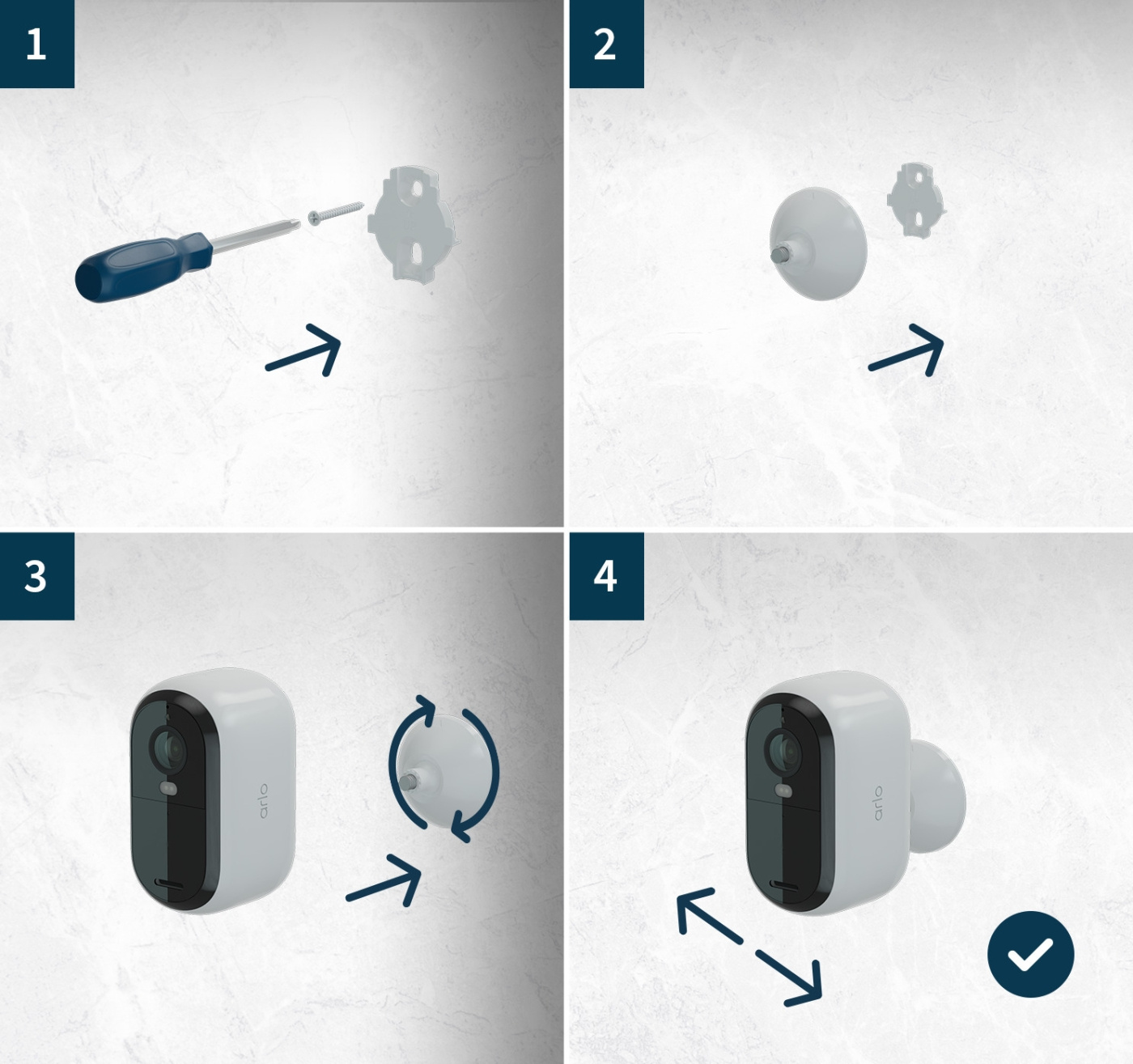 - Mukana: 3 x Arlo Essential kamera, 1 x sisätilan usb-latauskaapeli, 3 x kiinnitystarvikkeet, pikaopas