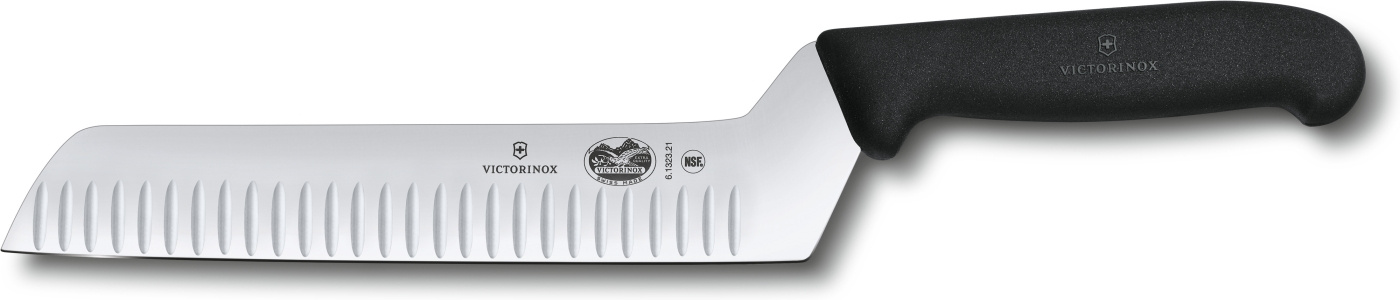 Victorinox -juustoveitsi Fibrox-kahvalla ja 21 cm terällä on loistava valinta yleisjuustoveitseksi, koska koonsa puolesta se soveltuu hieman suurempienkin palojen leikkaamiseen. Lovellisesta terästä juusto taas irtoaa paremmin kuin sileästä terästä, mikä helpottaa erityisesti pehmeämpien juustojen käsittelyä.