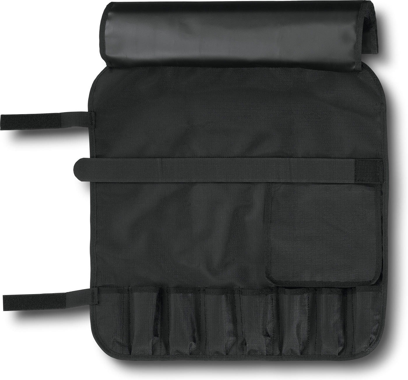 Victorinox -veitsilaukku on kestävää ja helposti puhtaana pidettävää PVC/polyesteriä ja sen saa näppärästi rullattua kasaan. Laukussa on tasku nimilapulle, pikkuveitset peittävä erillinen läppä sekä tarranauha, joka pitää isojen veitsien terät paikallaan.