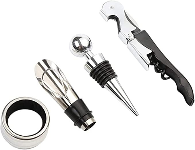 Tarpeellinen setti vieraiden varalta. Merimiesveitsiä voi käyttää viinin, samppanjan, oluen avaamiseen, alumiinifolion leikkaamiseen ja viinipullojen sulkemiseen laadun säilyttämiseksi. Viinirengas estää viinin valumisen ja kostuttamasta etikettiä, ja pidike on helppo hallita, mikä tekee viinistä arvokkaampaa.Viinikorkkiruuvi on valmistettu ruostumattomasta teräksestä, vahva ja kestävä, eikä sinun tarvitse huolehtia ruosteesta tai vaurioista.