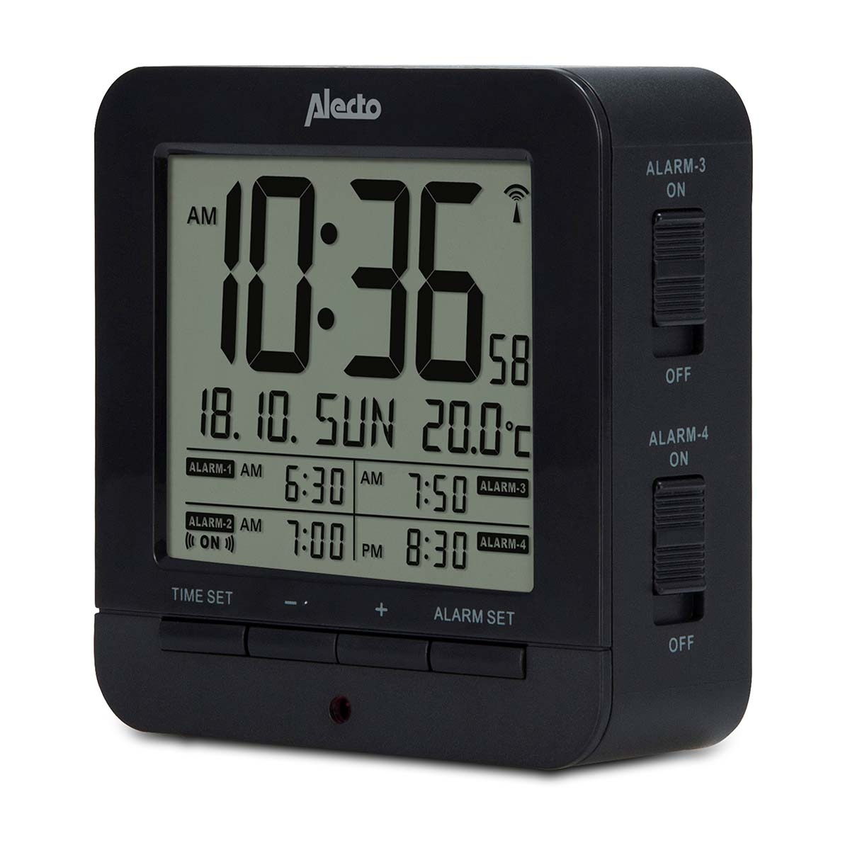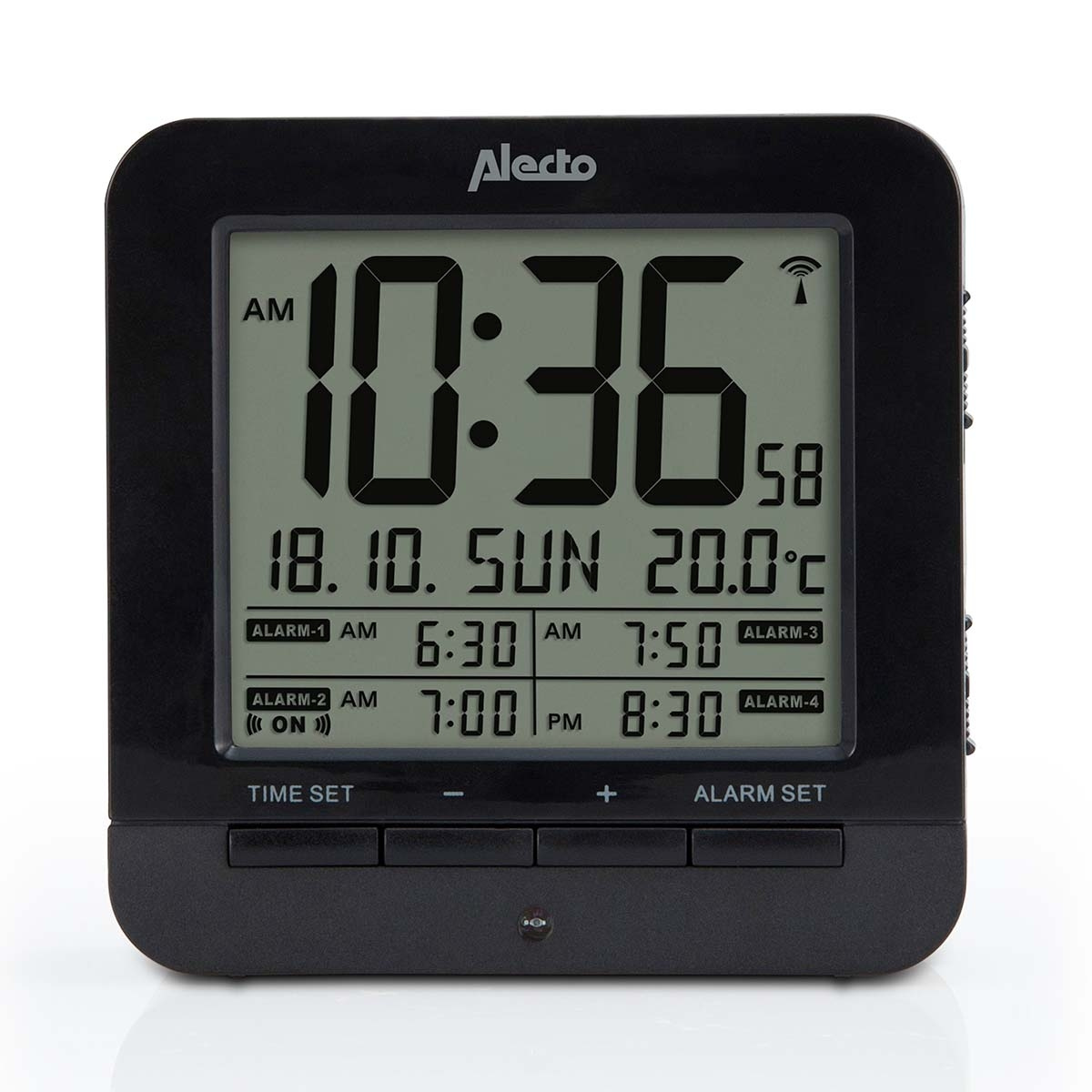 Tämän herätyskellon näytöllä näkyy runsaasti tärkeitä tietoja. Alkaen kellonajasta, joka ilmoitetaan tunteina, minuutteina ja sekunteina: millisekunnin tarkkuudella DCF-ohjatun kellon ansiosta. DCF-kellot saavat aikasignaalinsa atomikelloista ja poikkeavat siitä enintään muutaman millisekunnin. Aikaa ei tarvitse asettaa itse! Päivämäärä, päivä ja lämpötila näkyvät alla. Käyttäjän asettamat herätysajat näkyvät päivämäärän ja lämpötilan alapuolella. Voit asettaa tähän lämpötilaohjattuun kelloon yhteensä neljä herätysaikaa. Kätevä sinulle ja kumppanillesi epäsäännöllisiä työaikoja ja viikonloppuja varten. Voit mukauttaa 4 hälytysajankohtaa täysin päivittäisten rutiiniesi mukaan.