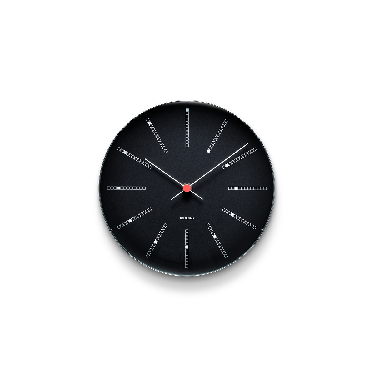 Arne Jacobsen Bankers -seinäkello Ø21 cm – Black Edition vangitsee tanskalaisen muotoilun ytimen pienemmässä, tyylikkäässä muodossa. Alun perin vuonna 1971 Tanskan keskuspankille suunniteltu kompakti versio sisältää samat ikoniset spiraalimaiset tuntimerkit ja minimalistisen estetiikan – uudistettuna tyylikkääksi mustaksi viimeistelyksi moderneihin sisustuksiin.