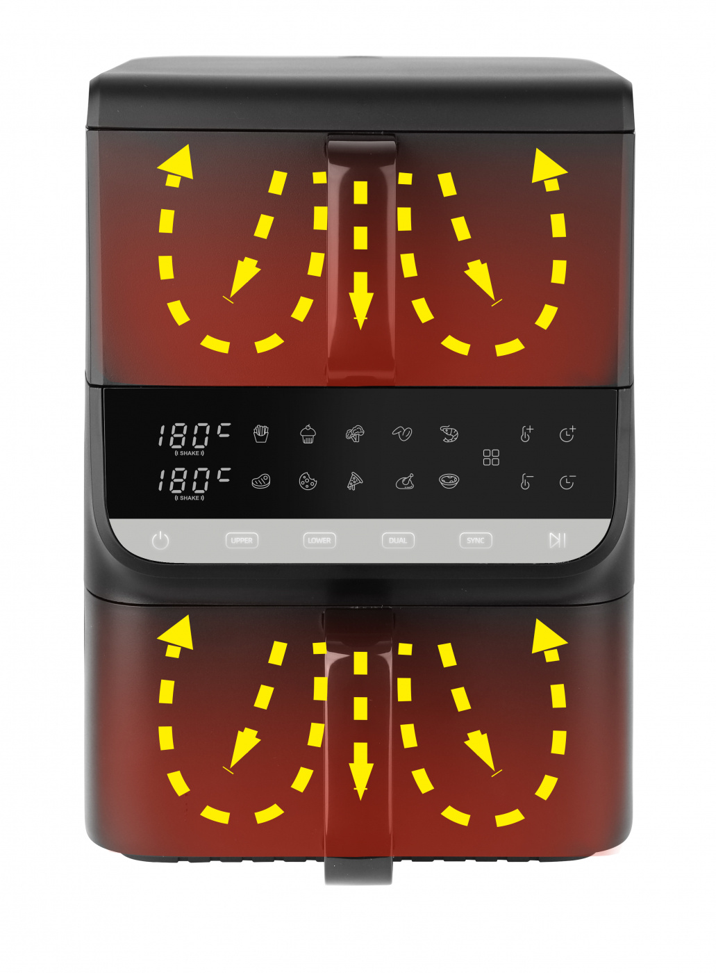 värmeelement och kan styras separat. Det finns även en synkfunktion så man kan få de bägge korgarna att få maten klar samtidigt.