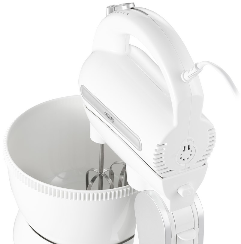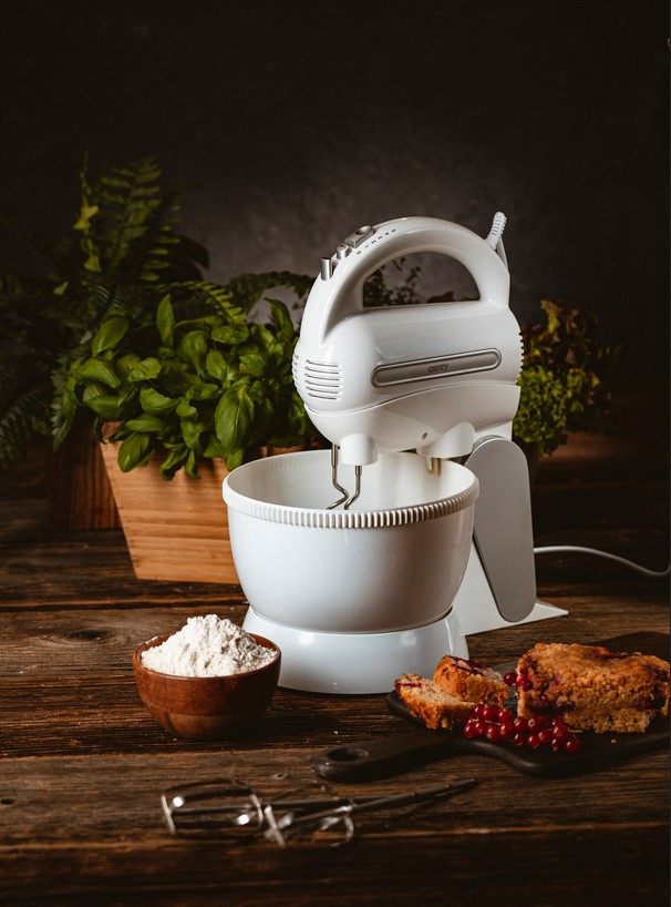 En mycket praktisk 600W mixer som är ett oumbärligt verktyg för alla som bakar bröd och kakor. Det gör att du kan använda den i 5 olika hastigheter, beroende på vilken typ av mat du lagar. På grund av detta kan den också användas för att blanda mjölet med andra ingredienser eller för att vispa äggvitor. Vid behov kan du använda TURBO-funktionen. Blandaren är mycket praktisk och pålitlig och kan användas under en längre tid utan risk för att den går sönder. Den roterande skålen med underjordiskt växelsystem gör det möjligt att använda mixern utan att hålla i den. Därför är den här modellen mycket mer användarvänlig än de vanliga.