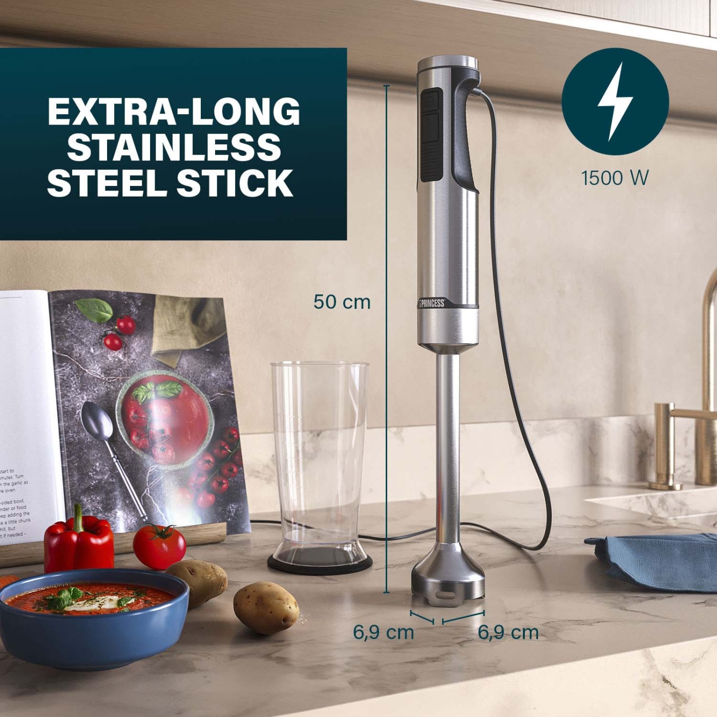 Extremt kraftfull och stark stavmixer med 1500 W motor och extra lång avtagbar stav i rostfritt stål på 50 cm. Designad med en kniv i rostfritt stål med 4 blad och mätkopp med lock/anti-slip funktion.