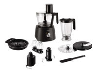Medföljande tillbehör Hackblad, spateltillbehör, ballongvisp, knådningsverktyg, tillbehör för juicepress, tillbehör för citruspress, justerbar skärskiva (1-7 mm), vändbar fin skärskiva (fin/grov), dubbel ballongvisp i metall