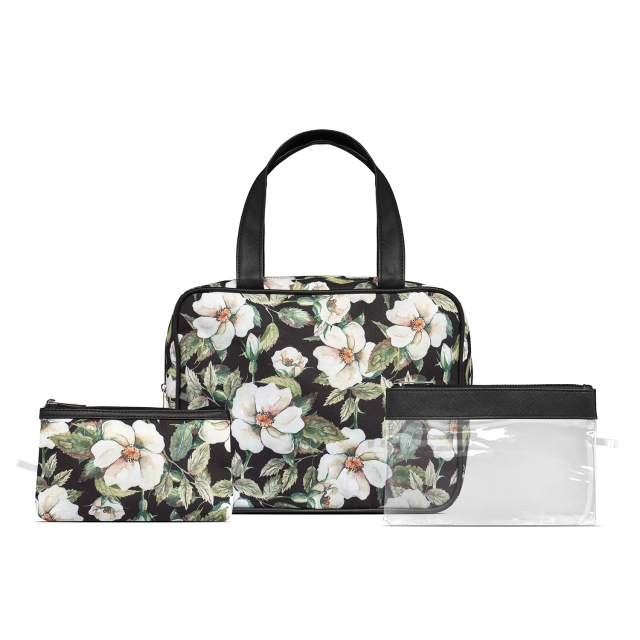 3-osainen toalettilaukkusetti mustalla printillä ja valkoisilla kukilla. Kaikki mitä tarvitset Suuri kosmetiikkalaukku, jossa on 2 kahvaa ja jonka sisustus koostuu 2 samankokoisesta verkkotaskuista, jotka antavat hyvän yleiskuvan kauneustuotteistasi, lisäksi on suuri vetoketjullinen tasku. Lisäksi meikkilaukku, esim. elektroniikkaa varten, kun olet liikkeellä, tai käytettäväksi kytkimenä illanviettoon. ja check-in-laukku PVC-vapaasta muovista, joka täyttää voimassa olevat IATA-määräykset.