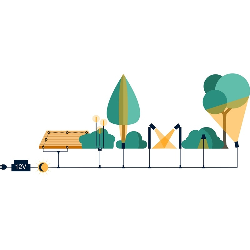 Lamporna i LED Garden Plug & Play-systemet får sin ström genom transformatorn som omvandlar spänningen från vägguttagets 230V till systemets 12V.