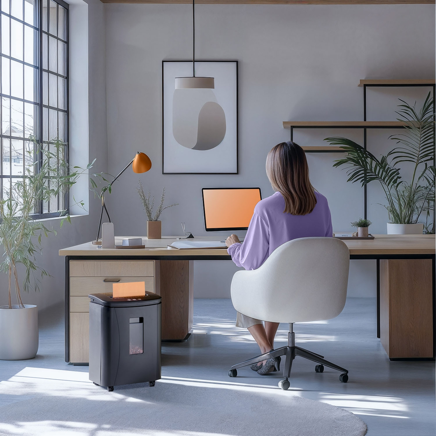 Hiljaisella moottorilla varustettu silppuri toimii huomaamattomasti, joten se sopii sekä suuriin että kotitoimistoihin. Laadukkaat teräsleikkurit käsittelevät niittejä, ja laitteessa on ulosvedettävä roskakori, johon paperijätteet on helppo hävittää. Turvaominaisuuksiin kuuluvat automaattinen sammutus ylikuumenemisen estämiseksi ja automaattinen peruutustoiminto paperitukosten poistamiseksi.