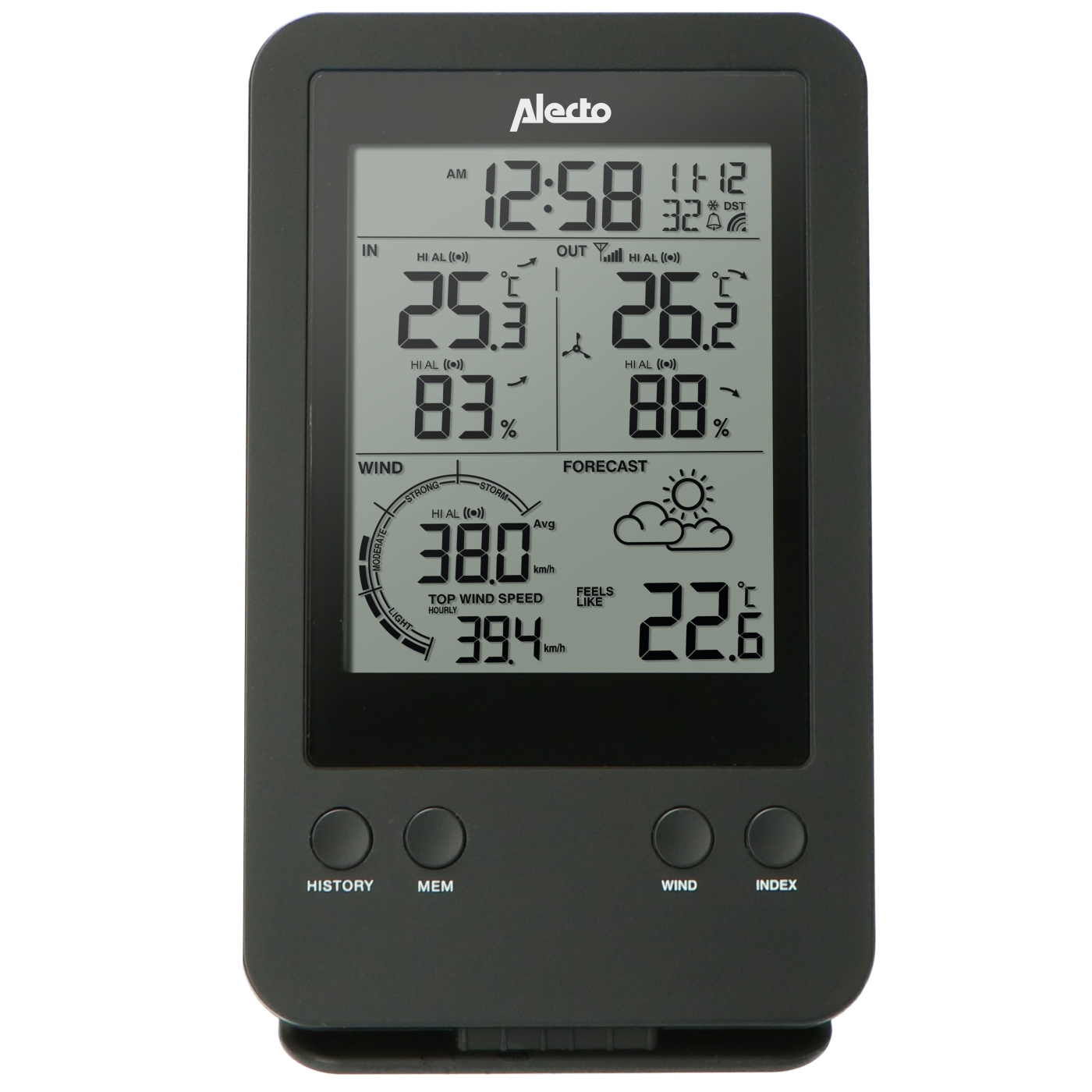 Alecto WS-3400 -sääasemassa on selkeä 5,5 tuuman näyttö, josta näet kaikki tarkat mittaustiedot yhdellä silmäyksellä. Lisäksi sääasema ilmoittaa kellonajan, päivämäärän, säähälytykset, ulkoyksikön signaalin voimakkuuden, pariston voimakkuuden ja sääennusteen seuraavaksi 24-72 tunniksi. Keltainen taustavalo tarjoaa selkeän ja helppolukuisen näytön. Sääasema sopii myös seinäasennukseen, mutta mukana toimitetun jalustan avulla se voi olla arvokas myös muussa käytännöllisessä paikassa talossa. Tämän korkealaatuisen sääaseman kompakti muotoilu sopii mihin tahansa sisustukseen.