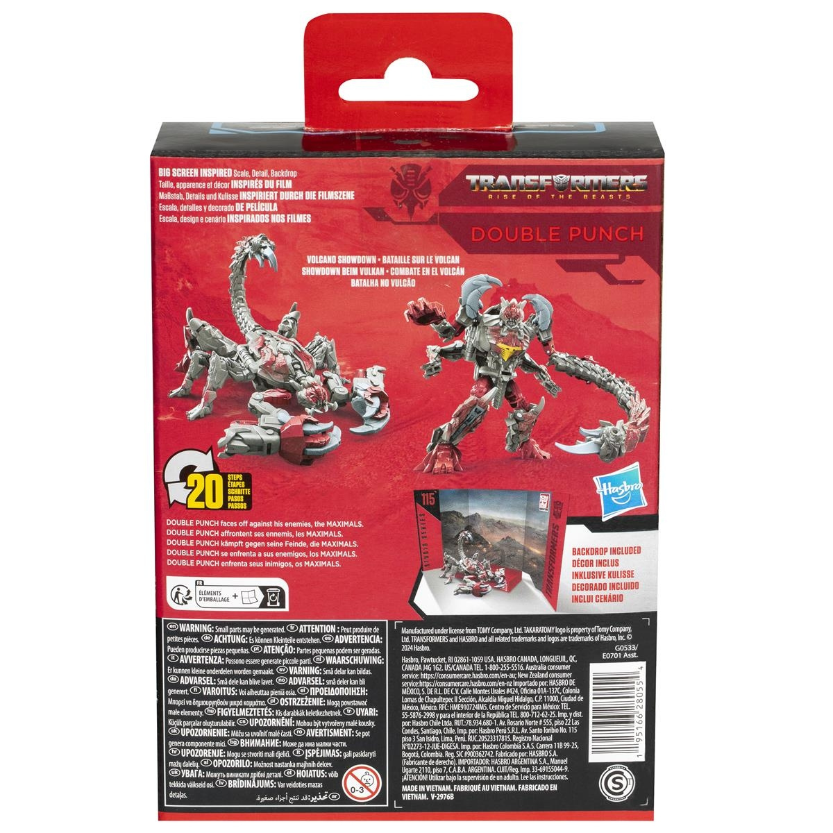 Koe Transformers-elokuvien jännitys Studio Series Deluxe Class Double Punch -toimintafiguurilla. Tämä keräilyhahmo on innoittamana Transformers: Rise of the Beasts -elokuvasta, ja sen avulla voit luoda uudelleen eeppisiä kohtauksia elokuvasta. Muunna hahmo robotista skorpioni-tilaan 20 askeleessa ja näytä se mukana tulevan Volcano Showdown -taustan kanssa, jotta saat elämyksellisen kokemuksen.