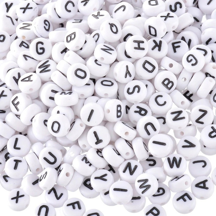 200 valkoista helmeä, joissa on sekalaisia kirjaimia. Kirjaimet menevät A-Z
