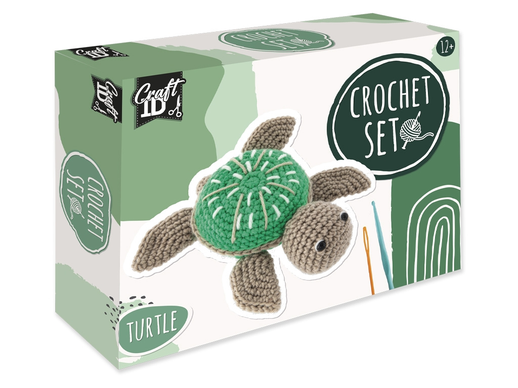 Virkkaussarja, Kilpikonna. Tämä sarja sisältää kaiken, mitä tarvitset kilpikonnan virkkaamiseen. Pakkaus sisältää eriväristä lankaa, virkkuukoukun, täytettä, silmät ja neulan