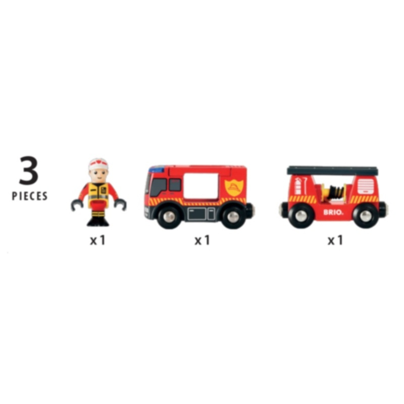 Tänään sinä olet palomies! Hyppää paloautoon, joka vetää perässään paloletkulla varustettua vaunua. Paina nappia, niin pillit menevät päälle. Muista nostaa varoitusmerkki ylös onnettomuuspaikalla. Paloauto, paloletkulla varustettu vaunu ja palomies sopivat yhteen BRIO World ‑tuotteiden kanssa. Paloautossa on valo- ja äänitoiminnot. Letkun voi vetää vaunusta ja se sopii täydellisesti palomiehen käteen.