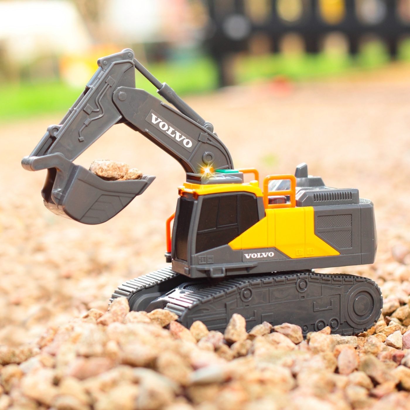 En kraftfull grävskopa med frihjul som har allt man kan förvänta sig från ett leksaksfordon. Den stora skopan kan röras från höger till vänster och justeras med hjälp av armen. Förarhytten kan även rotera för att flytta skopan - precis som på en riktig grävskopa. Grävskopan har även ljus- och ljudeffekter för att stimulera sinnena och fantasin.