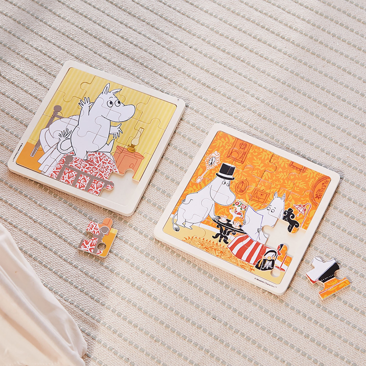 Tässä viehättävässä puupalapelissä on ihastuttava hyppivä muumimotiivi.