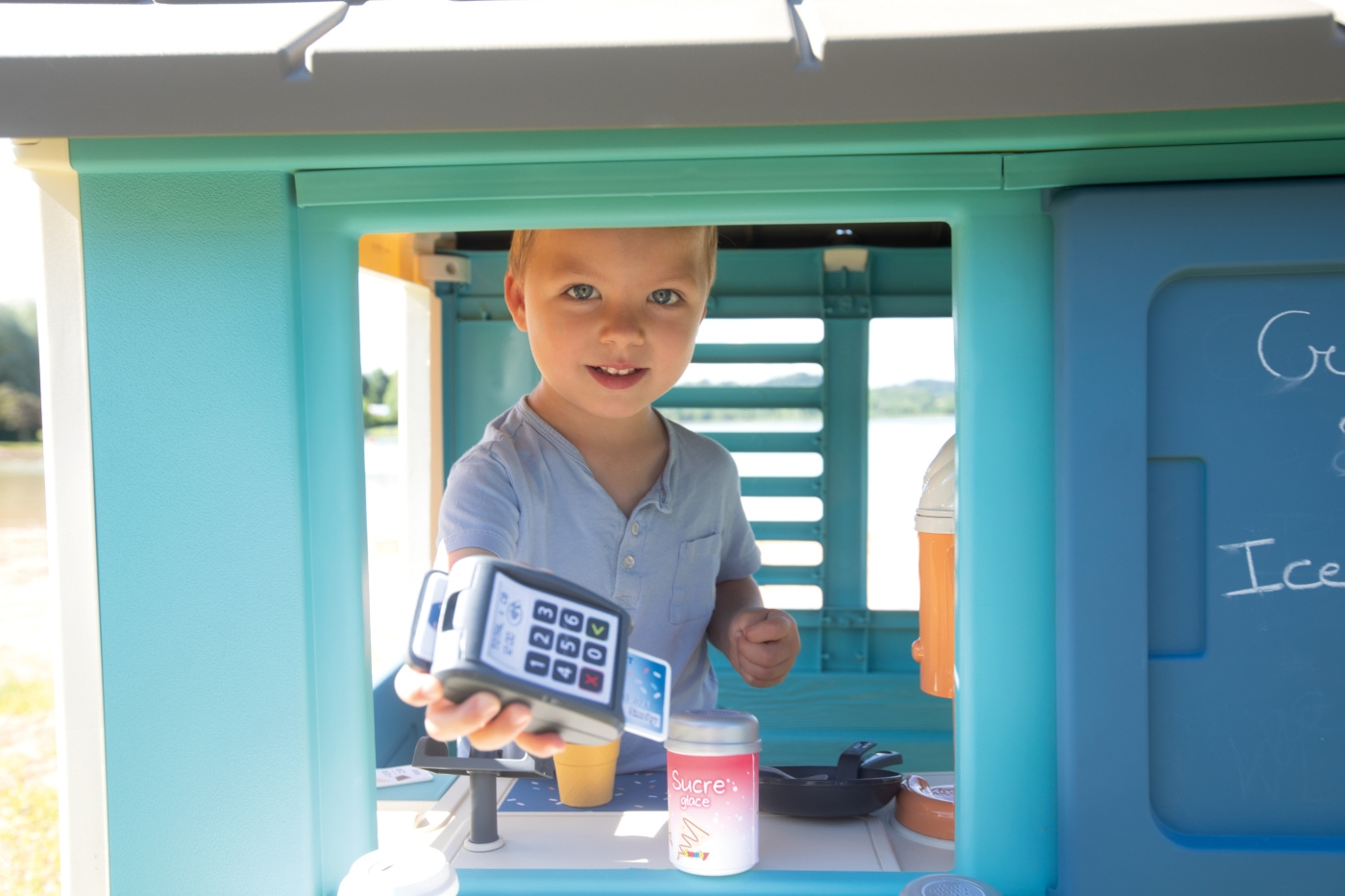 Smoby Sweety Corner -leikkimökki tarjoaa iloa kesäisiin kotileikkeihin! Leikkimökissä on takeaway-luukku, josta voi tarjoilla herkullisia välipaloja asiakkaille. Sweety Cornerissa on 2 ikkunaa sälekaihtimilla ja liukuikkuna, johon lapsi voi kirjoittaa ruokalistan. Mukana on kaksi valmistus- ja myyntitilaa: tiski asiakkaiden vastaanottoa varten ja leikkimökin sisällä tarjotin, jossa lapsi voi valmistaa pannukakkuja, jäätelöä (jäätelökoneella), juomia ja ottaa vastaan asiakkaiden maksun. Mukana runsaasti erilaisia tarvikkeita: 1 lautanen, 1 haarukka, 1 veitsi, 1 lusikka, 1 kannellinen muki, 1 paistinpannu pannukakkujen kääntämiseen, 2 pannukakkua, 2 jäätelöä, 4 kassakuittia, 1 kpl luottokortinlukija ja 1 luottokortti. Helposti koottava leikkimökki on vakaa ja tukevarakenteinen. Muoviosat ovat UV-suojattuja, mikä takaa hyvän kestävyyden ja värien kestävyyden ajan mittaan.