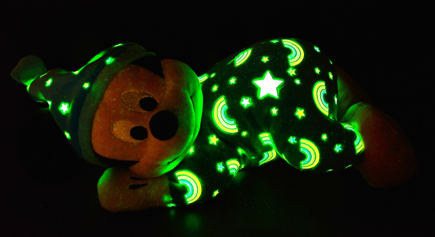Suloisen Mikki Hiiri pehmolelun yöpyjaman taivaankappaleet hohtavat tunnelmallisesti valoa pimeässä. Ihanan pehmeä unilelu kerää päivällä valosta energiaa itseensä, ja valojen sammuttua pyjaman kuviot heräävät eloon hienovaraisesti valaisten lastenhuonetta. Vastasyntyneille soveltuva unilelu ei siis tarvitse paristoja ja on turvallinen halia ja rutistaa.