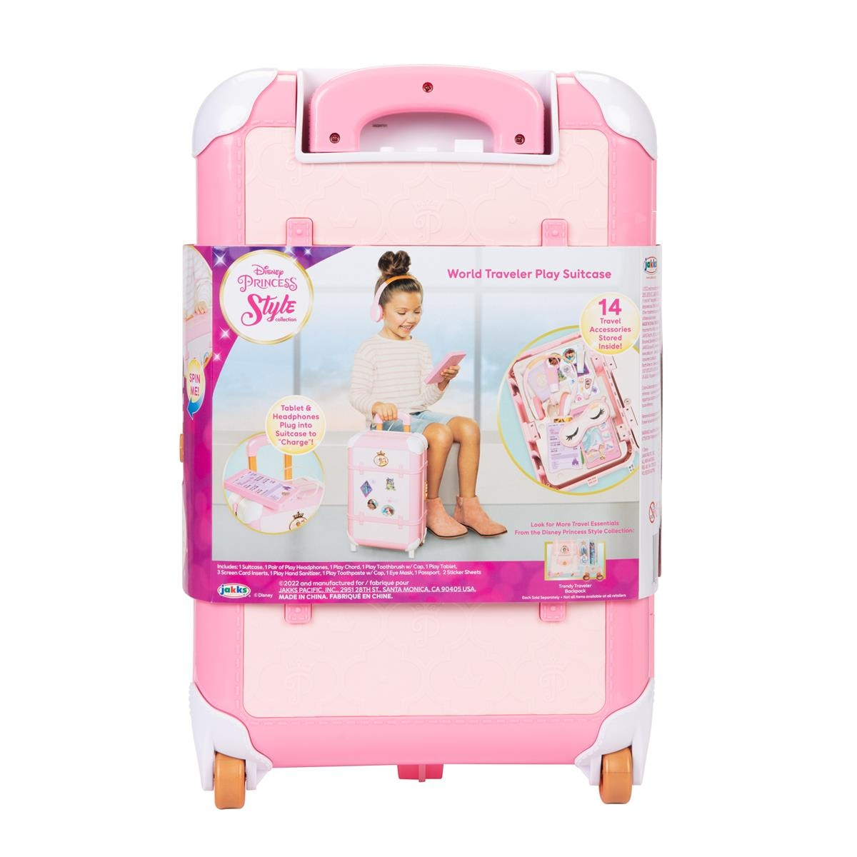 Disney Princess Style Collection World Traveler -leikkimatkalaukussa on kaikki, mitä prinsessa tarvitsee matkustaakseen tyylillä! Kaikki matkatarvikkeesi on katettu, ja ne säilyvät täydellisesti ah niin tyylikkäässä ja päivitetyssä leikkimatkalaukussa. Teeskentele turvaavasi tavarasi tekaistulla yhdistelmälukolla. Pidä yhteyttä lentokentällä kytkemällä leikkitabletti tai virkistäydy ennen lentoonlähtöä leikkihuulirasvalla ja käsihuuhteen puhdistusaineella. Aidot toimivat pyörät ja sisäänvedettävä kahva varmistavat, että ehdit aina lennolle! Rentoudu lennon aikana leikkikuulokkeiden ja silmämaskin avulla. Kun passi ja lippu ovat mukana, voit lähteä seikkailuihin kaukaisiin paikkoihin!
