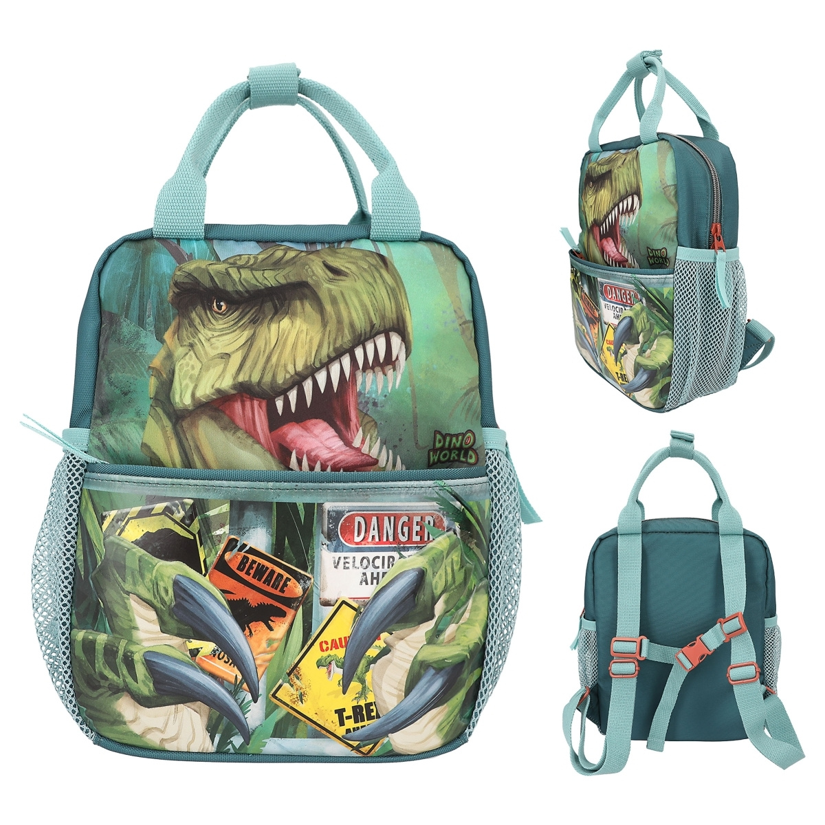 Vaarallisen viileä: Dino World Etupuolella on suuri T-rex-kuvio, ja siihen kiinnitetyssä etutaskussa on dinosauruksen kynnet ja kirkkaat varoitusmerkit 3D-ilmeessä. Ympäriinsä upeat tummanvihreät sävyt, turkoosinväriset hihnat, kahvat ja sivussa olevat verkkotaskut sekä ruosteenpunaiset yksityiskohdat. Sisäpuolen vuori on painettu dinosauruksen luupainatuksella. Materiaali: Kangas: materiaali: 100 prosenttia polyesteriä