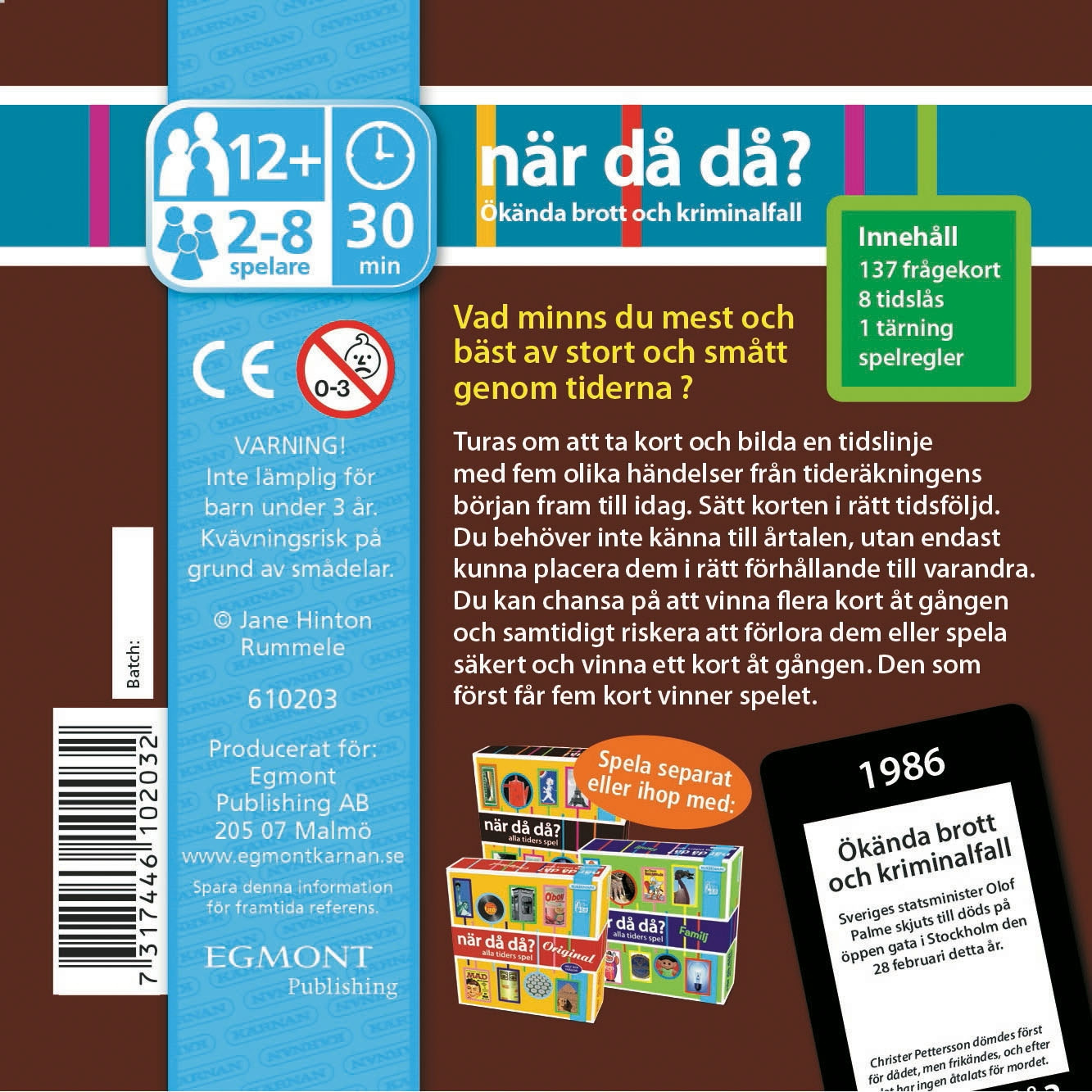 Haasta muistisi ja historiallinen tietämyksesi tämän taskukokoisen pelin avulla. Pelaajat vetävät vuorotellen kortteja ja luovat aikajanan, jossa on viisi erilaista tapahtumaa aikojen alusta nykypäivään. Tavoitteena on sijoittaa kortit oikeaan aikajärjestykseen ilman, että tarvitsee tietää tarkkoja vuosilukuja. Voit ottaa riskejä yrittämällä voittaa useita kortteja kerralla tai pelata varman päälle ja voittaa yhden kortin kerrallaan. Pelin voittaa se pelaaja, joka ensimmäisenä sijoittaa viisi korttia oikein. Peli on suunniteltu vähintään kahdelle pelaajalle, ja se sopii 12-vuotiaille ja sitä vanhemmille, joten se on hauskaa ja opettavaista toimintaa perheelle ja ystäville.