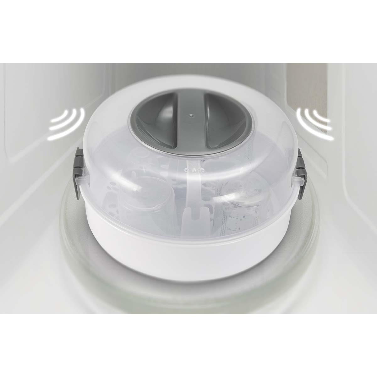 Steriliseringsflaskan är en robust, lätt behållare med lock. Du sköljer flaskorna och napparna och lägger dem upp och ner i behållaren. Häll cirka 120 ml vanligt kranvatten i botten av behållaren. Stäng behållaren genom att lägga på locket och ställ in den i mikrovågsugnen. Sätt på mikrovågsugnen på högsta inställningen i sex minuter, och du är klar. Flaskorna är nu skinande rena och kan hållas sterila i upp till 24 timmar förutsatt att locket på behållaren förblir stängt. Flasksterilisatorn har plats för fyra 150 ml-flaskor samtidigt och passar in i alla vanliga mikrovågsugnar.