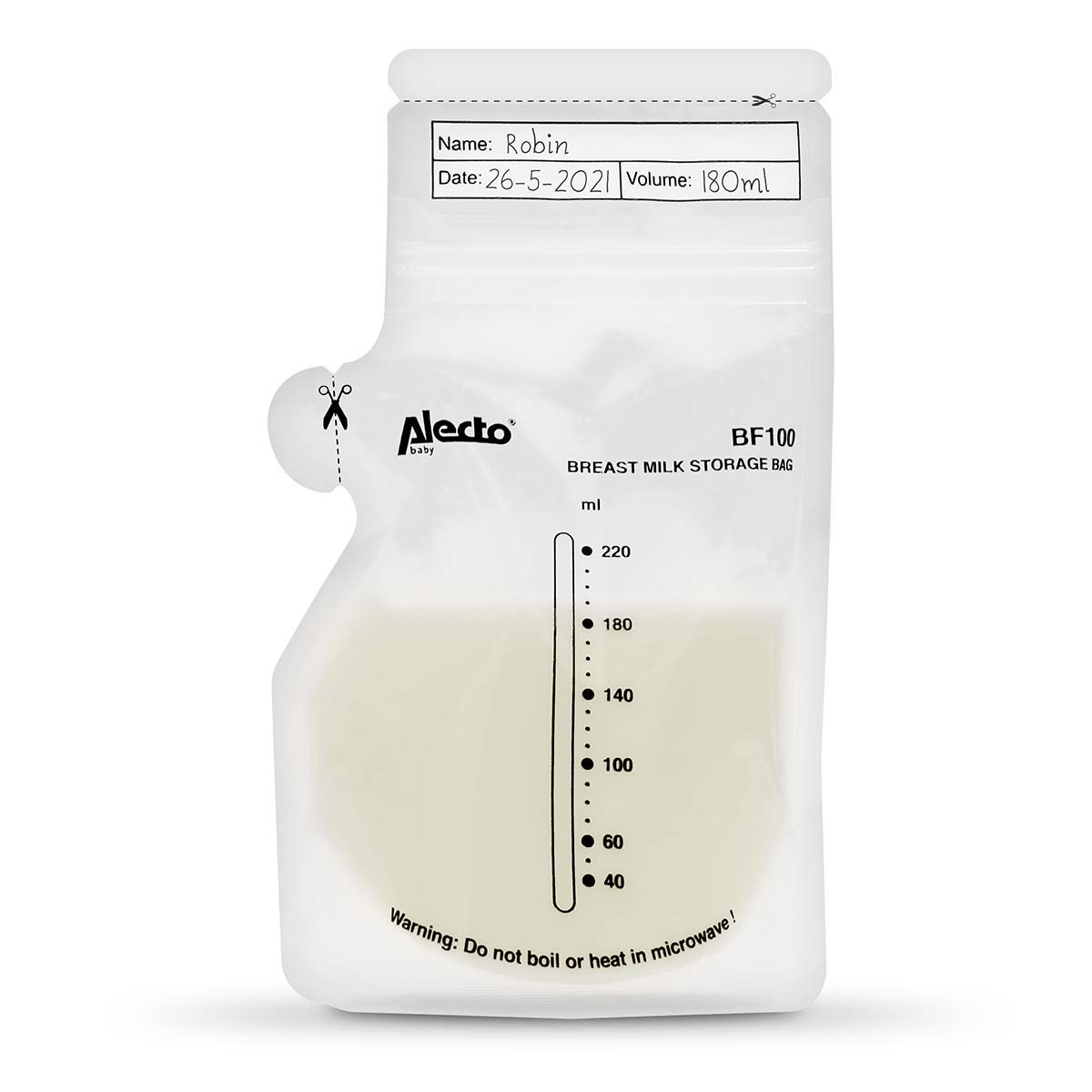 Pussit pysyvät pystyssä, joten niiden täyttäminen ja käsittely on helppoa ja hygieenistä. Kirjoituspinnan avulla voit merkitä maidon ilmaisun päivämäärän ja kellonajan, jolloin voit helposti seurata maidon tuoreutta. Pussit on suljettu kaksinkertaisella vetoketjulla, joten ne ovat täysin tiiviitä, mikä takaa turvallisen säilytyksen jääkaapissa tai pakastimessa.