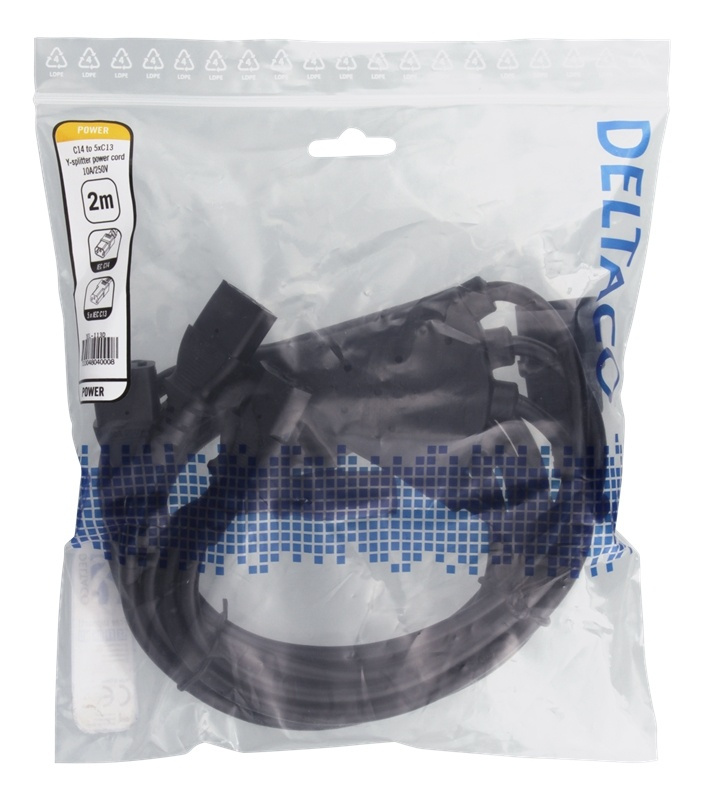 DELTACO laitekaapeli, IEC C14 - 5 x IEC C13, 2 m, 10 A / 250 V, Y-haaroitin, musta