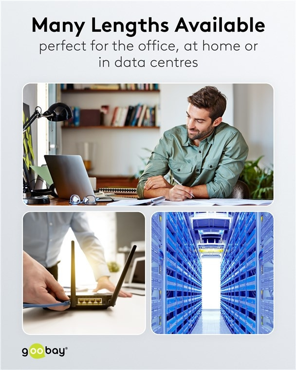 - Internetkabel med liten böjningsradie och hög flexibilitet för utrymmessnål installation, t.ex. i serverhyllor, dator- eller datacenter.