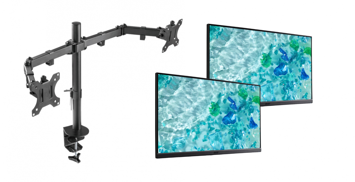 Tämä on täydellinen paketti, joka sisältää Deltaco Gaming GAM-040 -näyttötelineen ja kaksi Acer V247Y -näyttöä.