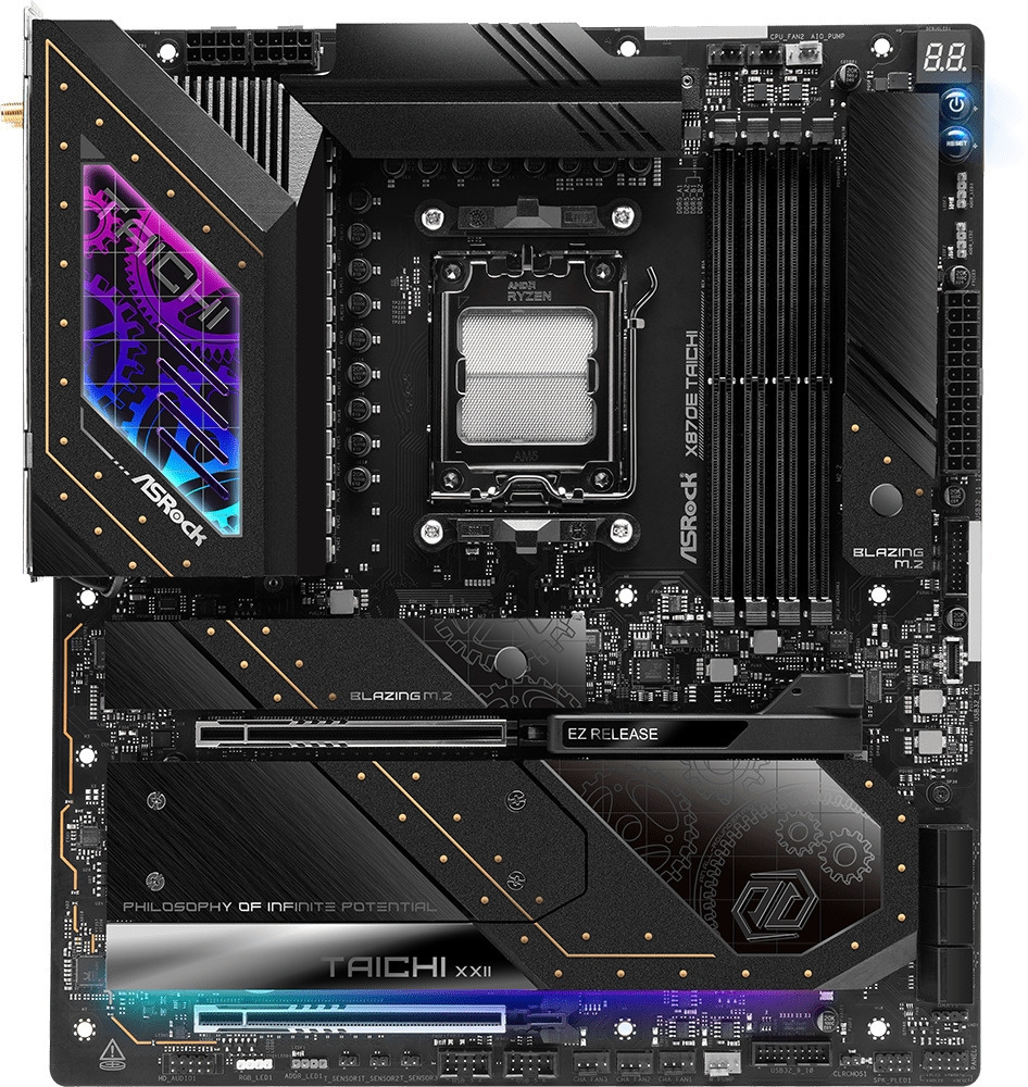 ASRock X870E Taichi on huippuluokan AM5-kantainen E-ATX -emolevy 7000/8000/9000 -sarjan Ryzen-suorittimille.