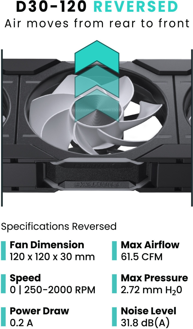 Phanteks D30-120 on varustettu integroidulla, koko kehyksen ja siipien D-RGB-valaistuksella kaikilla sivuilla. Useita D30-120-tuulettimia voidaan ketjuttaa yhteen silta-liittimillä ja ruuvipeitelevyillä kaapeleiden vähentämiseksi, mikä edesauttaa kotelon siisteyden ylläpitämistä.