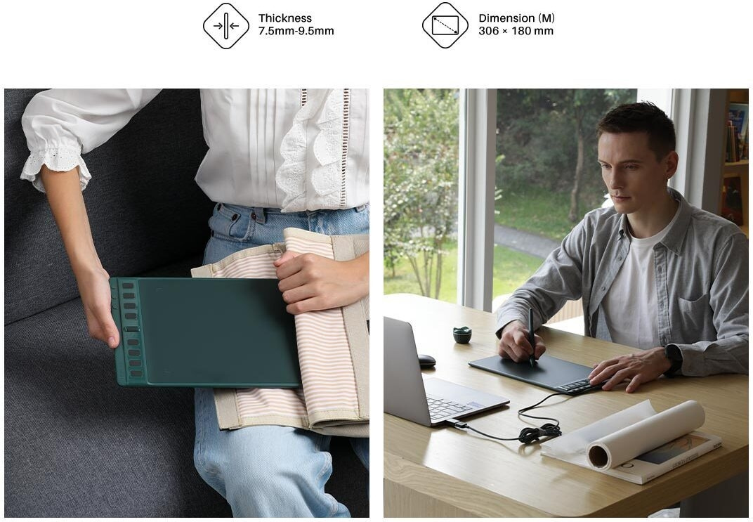 Inspiroy 2 -mallissa on kavennettu leveys ja kokonaispaksuus alle 1 cm, joten voit helposti pakata tabletin reppuun piirtämistä varten tien päällä. Vielä tärkeämpää on, että ohuempi runko vähentää ranteen epämukavuutta luomisen aikana.