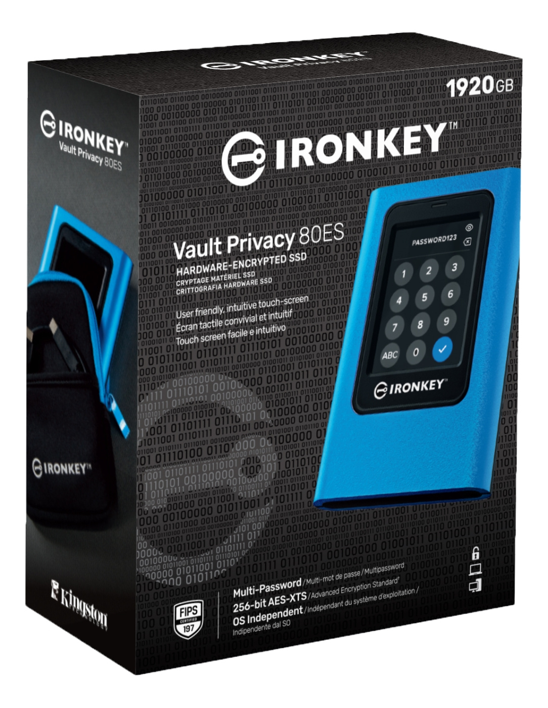 Kingston IronKey Vault Privacy 80 External SSD is Kingston’s first innovative OS-independent hardware-encrypted external SSD with touch-screen for data protection. VP80ES safeguards against Brute Force attacks and BadUSB with digitally-signed firmware. Brute Force attack protection crypto-erases the drive if the Admin and User passwords are entered incorrectly 15 times* in a row by default. The drive is FIPS 197 certified with XTS-AES 256-bit encryption using a Common Criteria EAL5+ (CC EAL5+) certified secure microprocessor, and is TAA compliant.