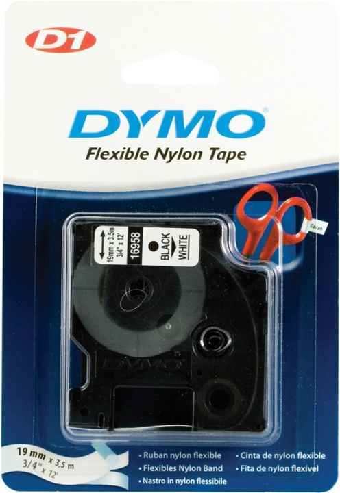 DYMO D1 merkkausteippi, nylon, 19 mm, valkoinen teippi/musta teksti, 3,5 m