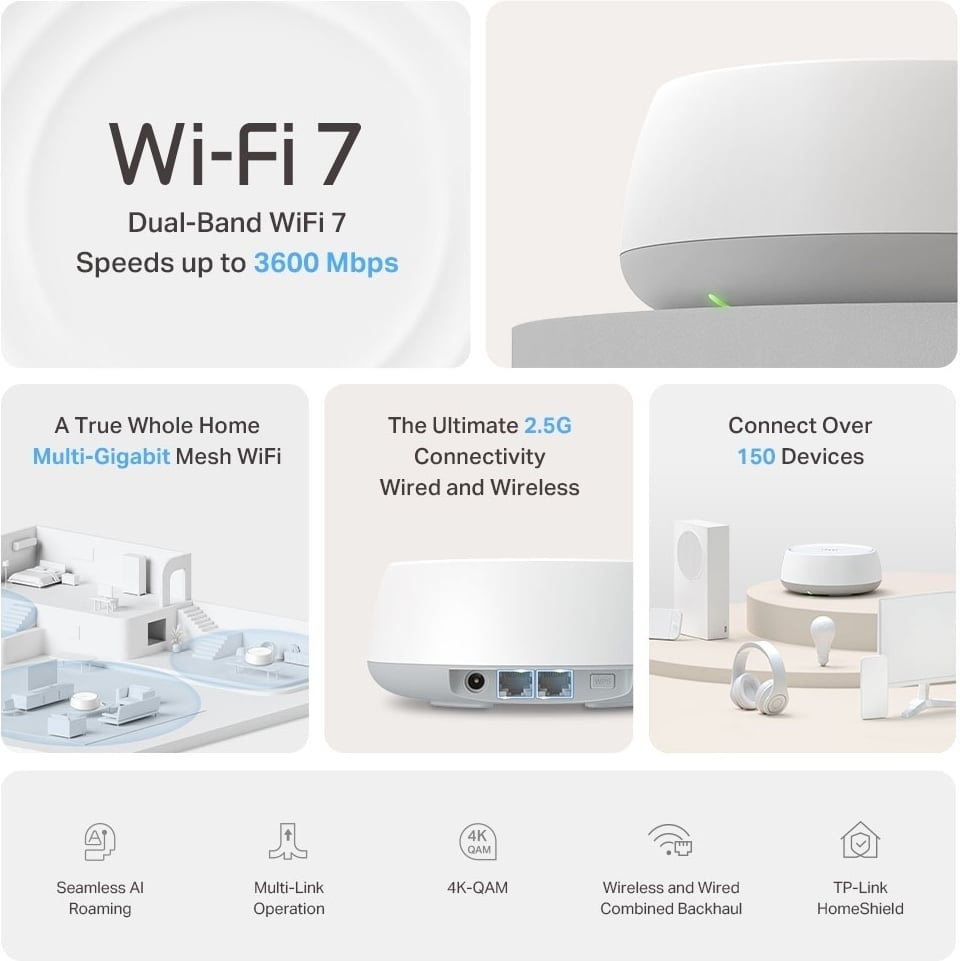 Deco BE25 on koko kodin Wi-Fi-ratkaisu, joka pitää verkkosi vahvana kotisi koosta ja rakenteista huolimatta. Tukiasemat voidaan asentaa käyttämään langatonta tai langallista runkoverkkoa tai niiden yhdistelmää takaamaan paras mahdollinen yhteys tukiasemin välillä. Järjestelmä käyttää yhtä verkon nimeä ja vaihtaa yhteyttä tukiasemien välillä saumattomasti tekoälyä hyödyntäen (AI-Driven Mesh) sekä pystyy multi-link operoinnin (MLO) ansiosta hyödyntämään useampaa data siirtokaistaa sekä eri taajuuksia tehokkaasti. Järjestelmä tukee jopa yli 150 yhtä aikaista käyttäjää. Deco BE25 on yhteensopiva myös WiFi 5 ja WiFi 6 laitteiden kanssa. Verkon laajentaminen on helppoa TP-link Deco reitittimillä.