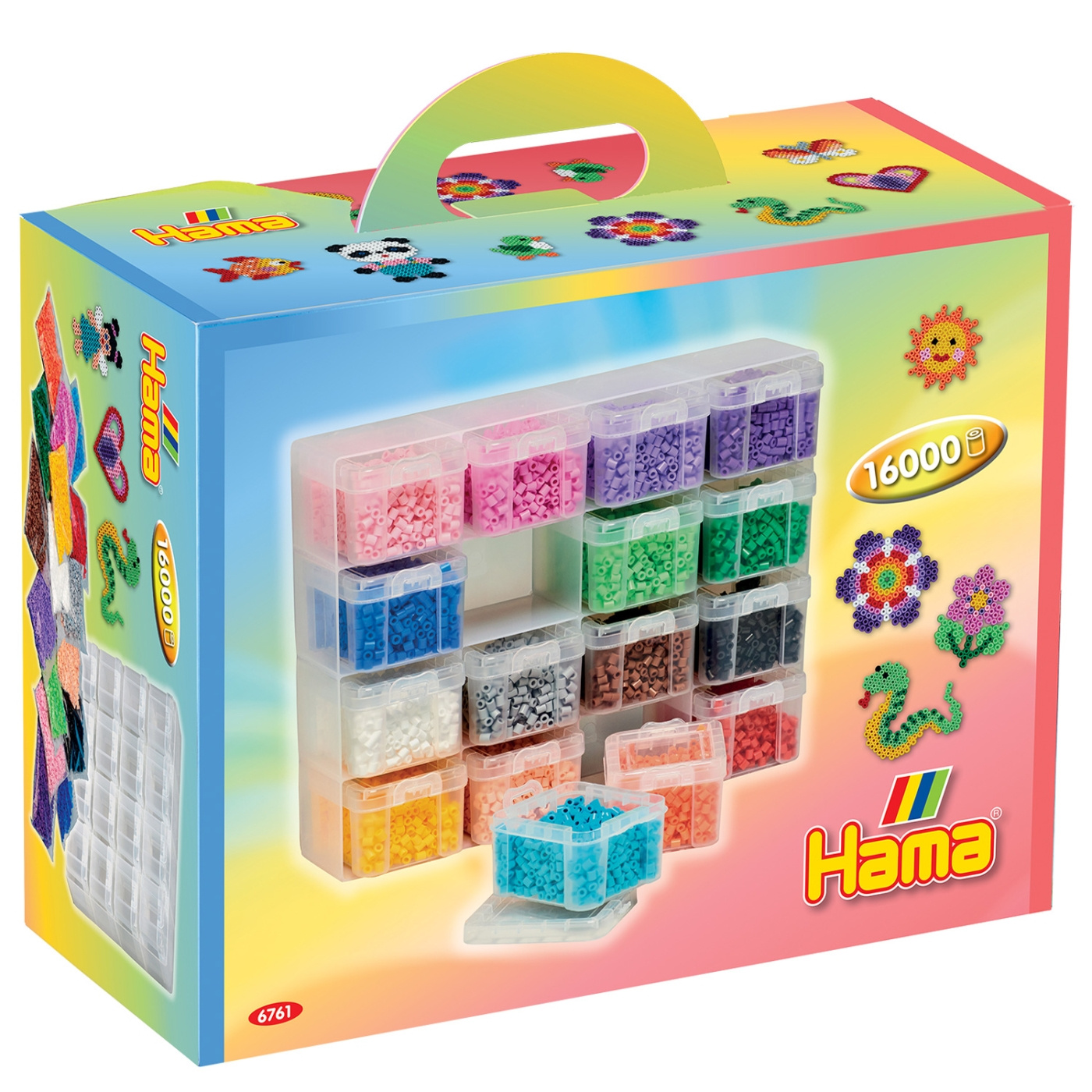 Hama Midi förvaringslåda med 16 fack och 16 påsar pärlor av varje sort.